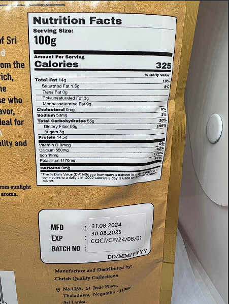 Each 100g contains 325 calories and includes fats and carbohydrates. It is balanced with nutrients that contribute to a healthy diet.